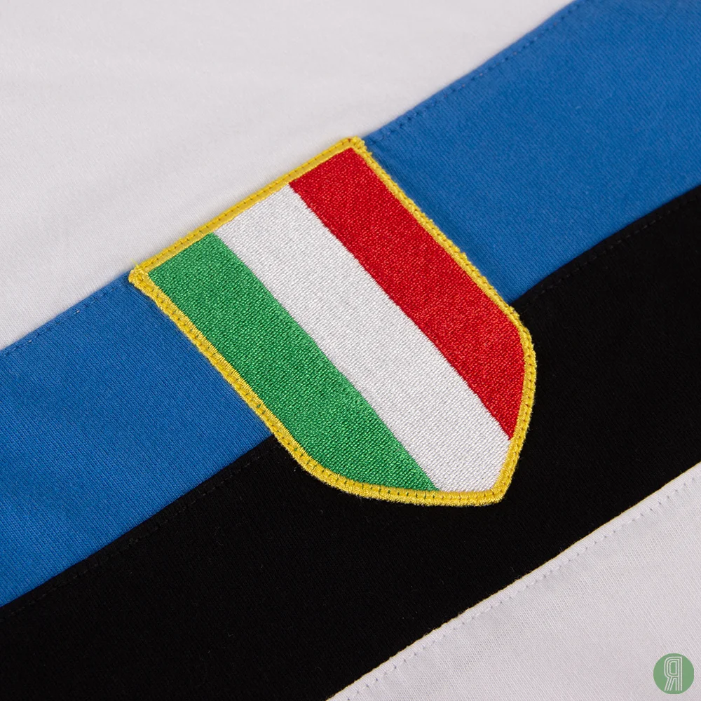 Dit shirt is een uniek exemplaar, gemaakt van biokatoen en met de grootste zorg gemaakt. Het is wit met een blauw-zwarte horizontale band en uiteraard een ‘Scudetto’ op de linkerborst, het embleem dat gedragen wordt door de regerend kampioen van de Serie A.
