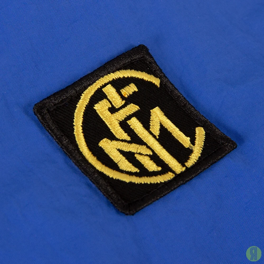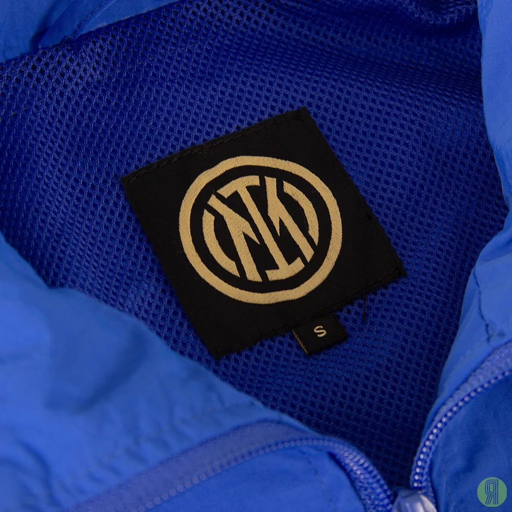 Het trainingsjack is zo’n typisch trainingsjack uit de jaren ’90. Ze werden ook wel trilobal genoemd. Het gevoerde jack beschermt prima tegen wind en regen, maar het ademt wel. Het blauwe jack is afgewerkt met zwart en gele elementen rond de schouders en borst. Op de linkerborst is het logo van Internazionale FC genaaid, met daarboven een gouden ster, want in die jaren had Inter al tien scudetto’s gewonnen en als je tien keer kampioen van de Serie A bent geworden mag je dit laten zien.